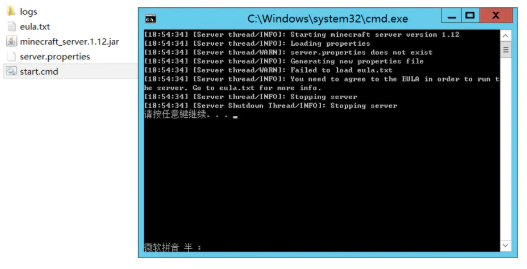 第一次启动服务端会失败,你需要打开服务端文件夹内的eula.txt